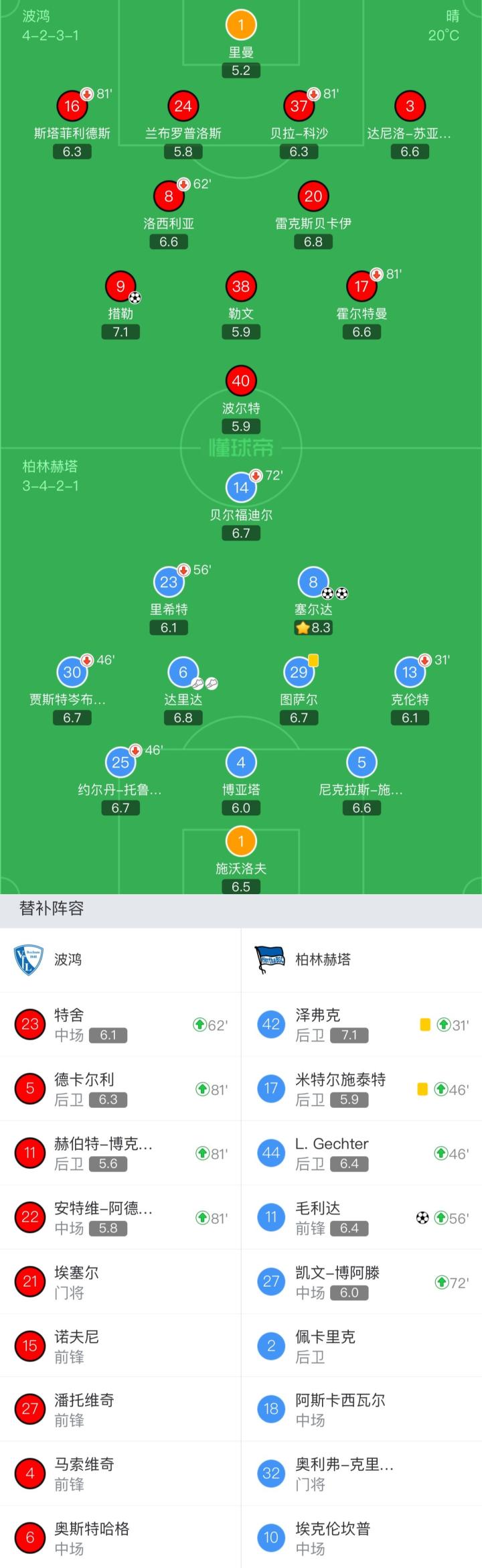 波鸿首发:1-里曼、16-斯塔菲利德斯(81'11-赫伯特-博克霍恩)、24-兰布罗普洛斯、37-贝拉-科沙(81'5-德卡尔利)、3-达尼洛-苏亚雷斯、38-勒文、8-洛西利亚(58'23-特舍)、20-雷克斯贝卡伊、17-霍尔特曼(81'22-安特维-阿德杰伊)、40-波尔特、9-措勒