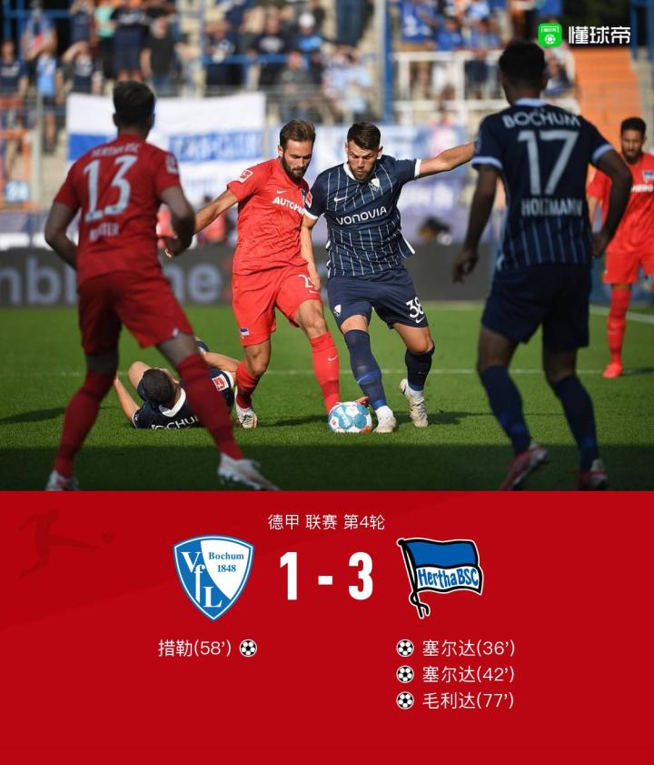 北京时间9月12日23:30,德甲第4轮,波鸿主场对阵柏林赫塔。上半场,洛西利亚头球顶偏,里希特远射打偏,塞尔达连入两球。下半场,措勒补射破门,毛利达远射建功,最终,波鸿1-3柏林赫塔。