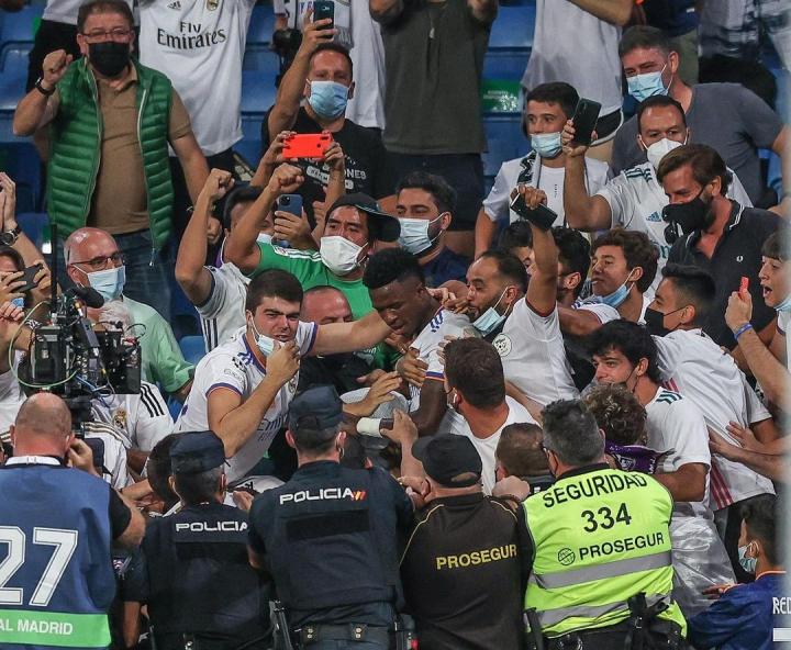 西甲第4轮,皇马主场5-2逆转击败塞尔塔,此役帮助皇马打入反超比分进球的维尼修斯在赛后晒出他与看台球迷庆祝的照片。