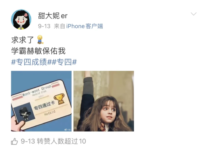 在某些高转赫敏帖的下方,你还能不时看到前来还愿的用户。他们说,就是因为转发了赫敏的画像,才让自己通过了考试、收获了爱情,各位兄弟姐妹们一定要来试试。