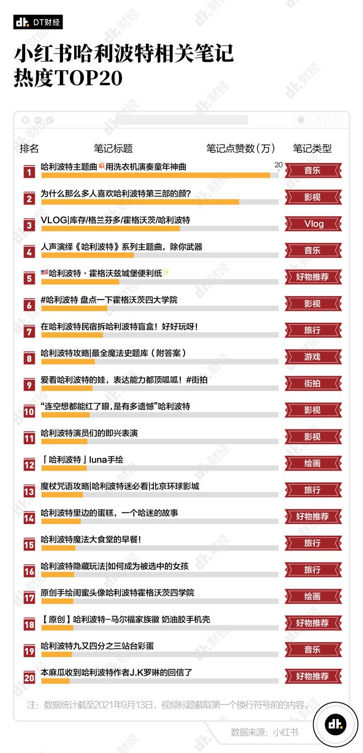 当我们在小红书搜索“哈利·波特”,并按热度降序选出了目前为止热度最高的 20 条笔记。