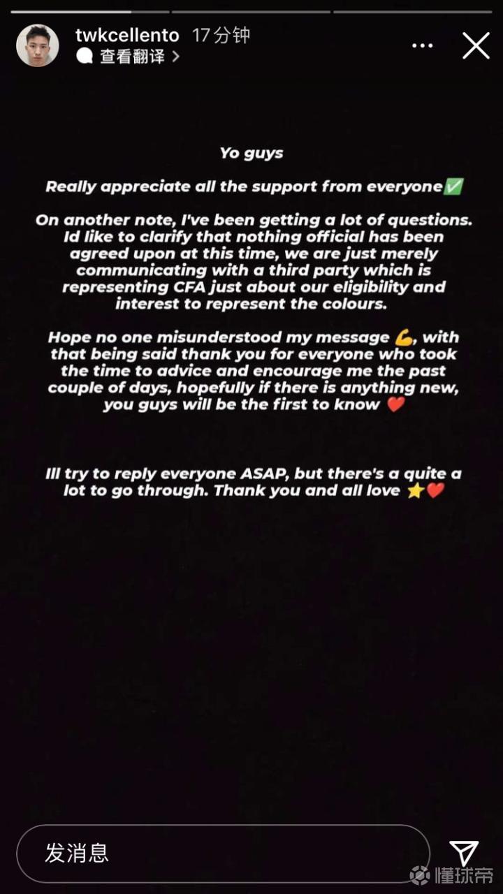 据该球员社交媒体上写道:最近关于我的未来有了新的发展,有自称是代表中国足协的第三方人士与我的经纪人取得了联系,询问我关于国籍转换的兴趣和想法,并可以安排我到中国的球队进行试训。鉴于对马来西亚足协的失望,我正在考虑接受此事。我们已经就此事讨论过很多次,每一次都更接近于达成一致。如果有更多进展,我会公布给大家。