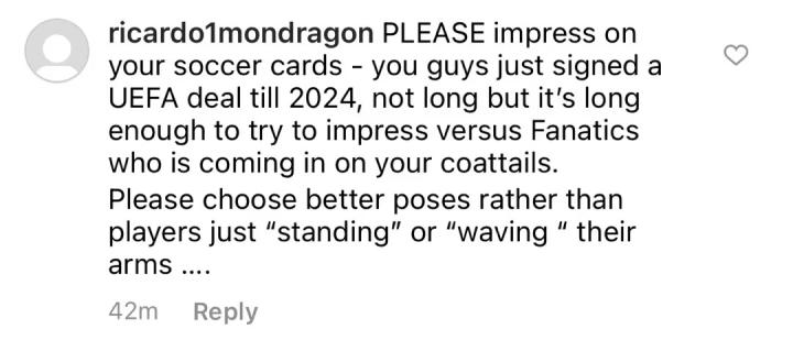 “我知道你们最近和欧冠的合作续到了2024年,说短不短,说长不长。但面对Fanatics的即将入局,你们还是得趁早打动卡迷,建立起自己的壁垒啊。你们可长点心吧,别一天到晚就是用球员站着或挥手的选图了。”