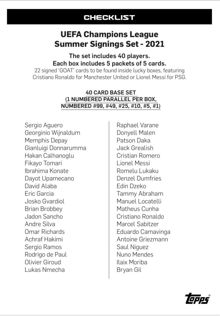 Checklist中共含40位今夏披上新球队战袍的球员,值得一提的是,这版卡将成为梅罗今夏转会穿上巴黎战袍/重披曼联战袍后问世的第一款签字卡,卡迷有机会在Lucky Box中拆出共计22张梅罗签字,数量极其稀少。