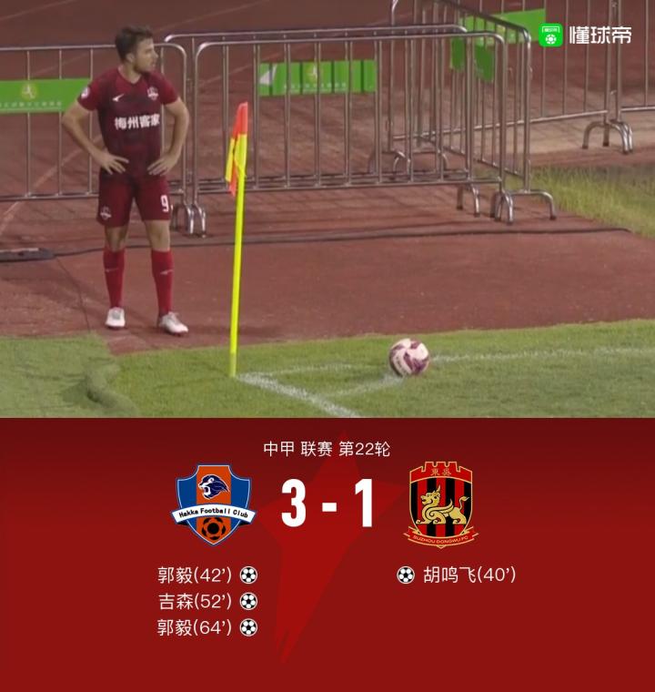 北京时间9月16日19:35,中甲第22轮,梅州客家对阵苏州东吴。上半场胡鸣飞接角球头球破门,3分钟后郭毅单刀进球,双方战成1-1;下半场开场伊高-沙托尼助攻吉森反超比分,郭毅接梁学铭直塞单刀进球,吉森伤退,最终梅州客家3-1逆转苏州东吴。