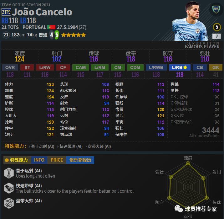 坎塞洛能力非常全面,模型也不错,21TS是普通体型不再是瘦弱了,这让坎塞洛对抗能力增强。坎塞洛速度极快,回追任何人都没问题,抢断拦截都非常出色。进攻方面坎塞洛的传中非常出色,还有一脚远射,在进攻端能有不错的贡献。坎塞洛是非常优秀的攻守兼备的边后卫。赛季选择方面21TS和20U是比较推荐的,MC、OTW和BOE高强也可以选择但会稍显逊色一些。