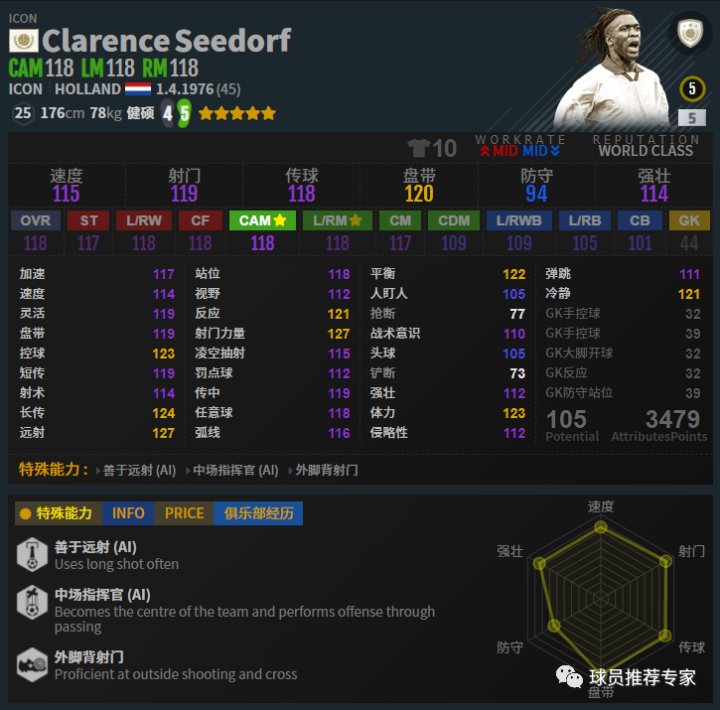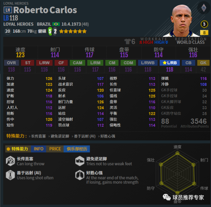 罗伯特·卡洛斯非常的敦实,对抗能力很强,真心能挤能撞。速度也非常快,回追的时候犹如一辆飞奔的小坦克,气势逼人,想强吃卡洛斯几乎是不可能的。进攻方面也相当棒,传中不错,远射更是夸张,只要给卡洛斯禁区弧顶附近左脚远射,那绝对是石破天惊的,守门员非常难防。赛季选择方面ICON的工资确实太高了点,除非工资宽裕否则难以选择。LH和MC是比较不错的两个赛季,比较推荐,HOT则稍差一些。