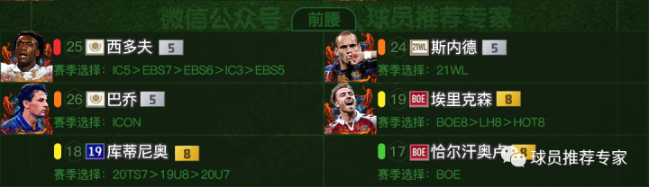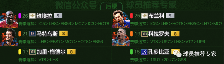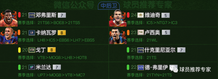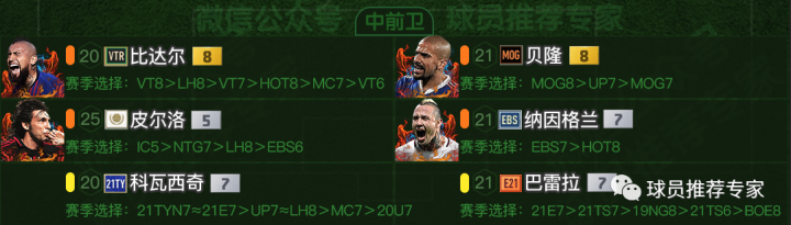 中前卫比达尔是非常推荐的极品B2B中场,贝隆和纳因格兰也是不错的选择。皮尔洛的话工资偏高了但是强度却只有橙级中游强度,而且搞到银卡也是难度较大,平民来说不太推荐。科瓦西奇和巴雷罗可作为替补选择。