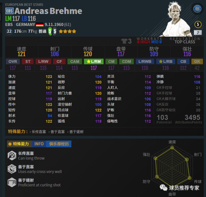 布雷默是非常推荐的一名边后卫,实战效果远大于数据显示,虽然他的数据也不赖。双5脚配合上优秀的出传中能力和超强的远射能力,让他在进攻端非常有威胁。防守方面也相当不错,模型也还不错,身高虽然不算高但是体重有77kg,一般的边锋还真不能在身体对抗上在布雷默身上占到什么便宜。而且布雷默AI很不错,感觉他抢断卡位很聪明,再加上还不错的身体轻松能将球抢下把对方卡在身后。赛季选择方面EBS和LH都是不错的选择,HOT如果高强也可以用。