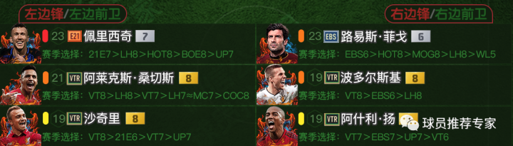 边锋方面“佩剑”佩里西奇是非常不错的首发选择,虽然能力值不高但是强度和模型都非常不错,是非常优秀的一名边锋。路易斯·菲戈、波多尔斯基和阿莱克斯·桑切斯都是很不错的具备首发资格的边锋,由于国米边锋位置稍弱所以波多尔斯基推荐到边锋玩内切爆射。沙奇里和阿什利·扬可作为替补选择。