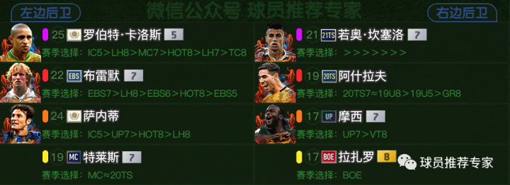 边后卫方面人才太多了,这里两位高工资的ICON也推荐一下吧,如果你工资超了可以选择其他赛季,比如罗伯特·卡洛斯ICON25工资太高,选择LH赛季也是不错的选择。兄弟萌一定要灵活千万不要跟呆头鸭一样,我这边只是列举兵器库,而哪样兵器秤手就看你自己了。卡洛斯如果工资够确实是强度很高的,萨内蒂就比较一般了,但也还行,不过和其24的高工资确实稍微有点不匹配。坎塞洛、布雷默和阿什拉夫都是非常棒的首发现在,摩西如果金卡也是可以达到红级的。特莱斯和拉扎罗强度也还可以,不过国米边后卫人才太多,这俩只能打替补了。