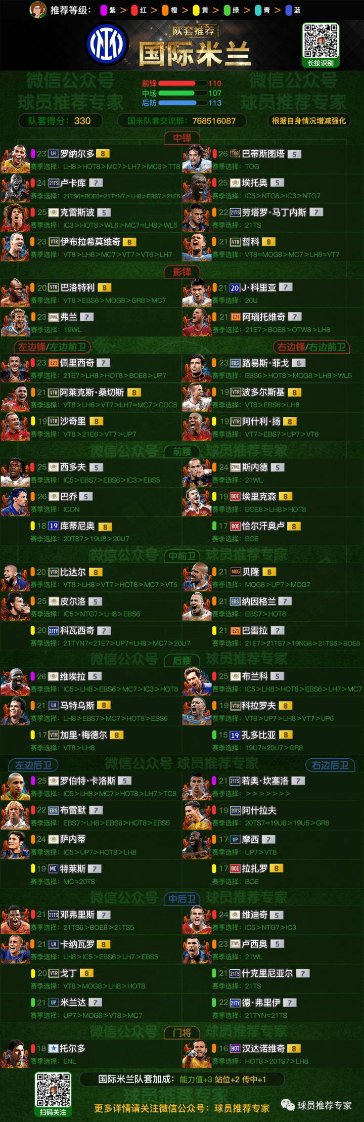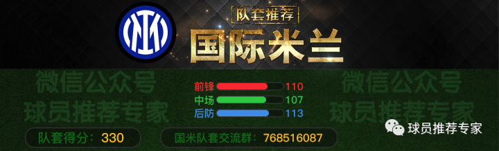 我们可以设定一套规则来反应队套强度。设定紫色12分,红色10分,橙色8.5分(最终结果四舍五入),黄色7分,绿色6分,青色3分,蓝色1分,统计36人大名单的球员的得分(前锋方面:中锋+影锋6名,边锋6名;中场方面:前腰、中场、后腰各4名;后防方面:中卫6名,边后卫4名,门将2名)。根据规则得出国米套的36人总得分是:330。