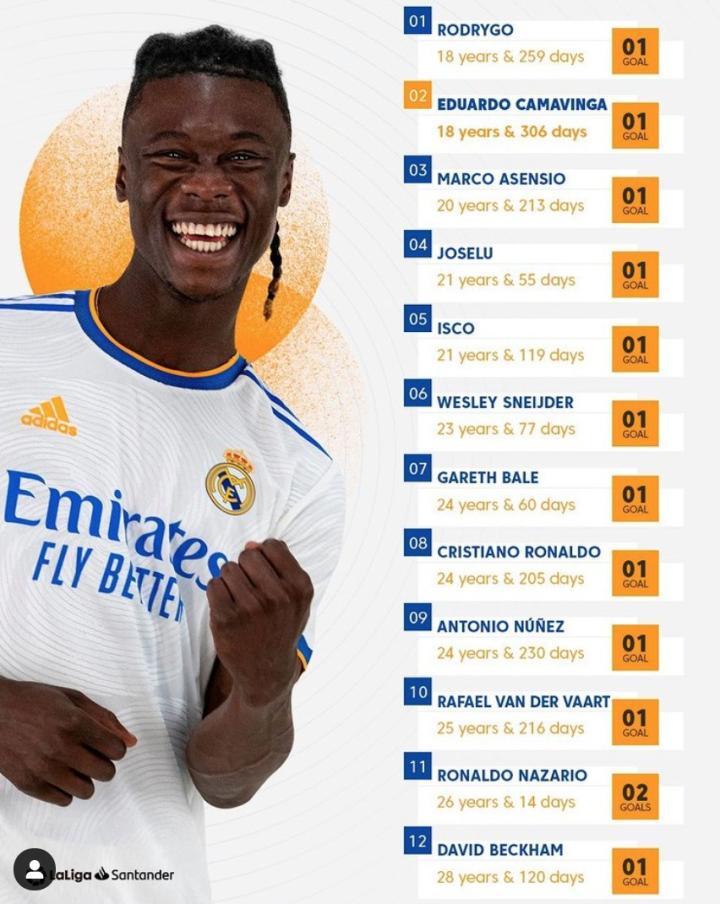 在西甲首秀中,卡马文加就代表皇马取得了进球,西甲官方盘点了联赛首秀即进球的皇马球员年龄排行。
