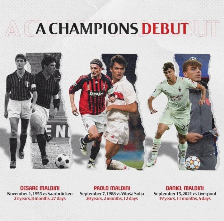 1955年,切萨雷-马尔蒂尼在米兰对阵萨尔布吕肯上演欧冠首秀(23岁8个月27天)。1988年,保罗-马尔蒂尼在对阵vitosa sofia时上演欧冠首秀(20岁2个月12天)。