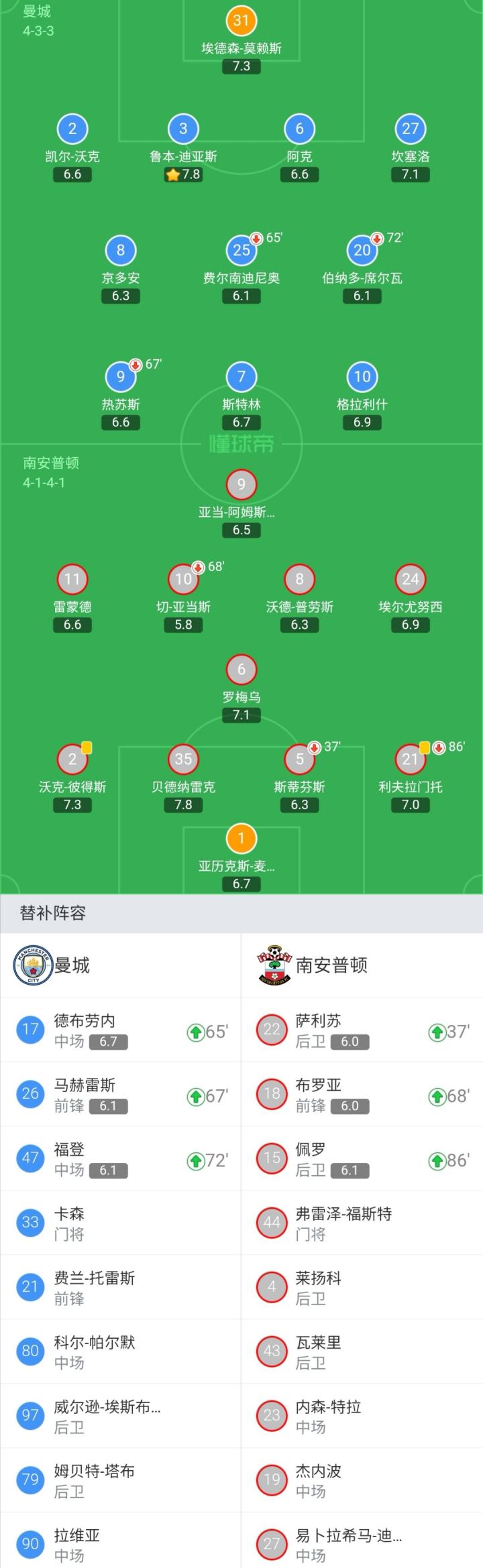 曼城首发:31-埃德森-莫赖斯、2-凯尔-沃克、3-鲁本-迪亚斯、6-阿克、27-坎塞洛、25-费尔南迪尼奥(64'17-德布劳内)、8-京多安、20-伯纳多-席尔瓦(71'47-福登)、9-热苏斯(66'26-马赫雷斯)、7-斯特林、10-格拉利什