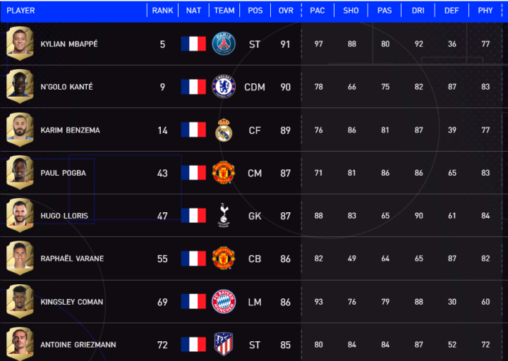 FIFA22中能力值最高的8位法国球员:1 姆巴...仰卧撑邱翼曦 @懂球帝2021-09-18 09:32FIFA22中能力值最高的8位法国球员: 1 姆巴佩 91 2 坎特 90 3 本泽马 89 4 博格巴 87 4 洛里 87 6 瓦拉内 86 6 科曼 86 8 格列兹曼 85展开更多