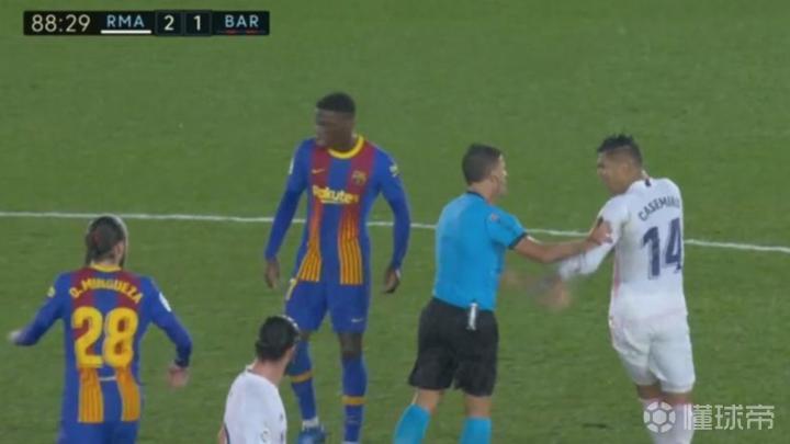 在上赛季皇马2-1击败巴萨的西班牙国家德比中,卡塞米罗曾在比赛第88分钟飞铲梅西,随后被曼萨诺出示黄牌警告。随后,卡塞米罗对裁判表达了不满,并且向曼萨诺做了一个向下拍的手势,但是曼萨诺没有向其出示第二张黄牌。不过,在短短一分钟后,卡塞米罗还是因为又一次犯规被罚下。