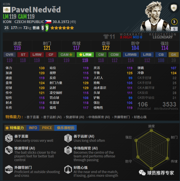 内德维德是非常厉害的一名边路选手,实战效果要强于其数据体现的。177,72的模型乍一看会感觉是不是不太能抗人,但实战来看是完全可以抗人,具备还不错的对抗能力,应该是特制了,这和德布劳内、凯尔·沃克有点类似的,体重轻但是对抗不弱。而且最可怕的就是内德维德的远射能力,真的太恐怖了,基本只要抬脚就有,而且双5脚左右开弓,真心防不胜防。不仅如此传中能力还非常出色,体能也极为充沛,还具备不错的防守能力,真的有点变态。有条件直接入ICON吧,条件差一点的那只能选择其他赛季卡了。