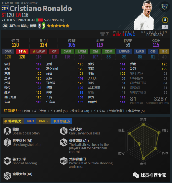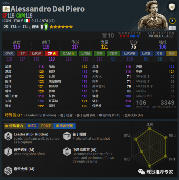 德尔·皮耶罗是非常优秀的一名影锋,皮耶罗禁区弧顶附近的“皮耶罗区域”打ZD威胁是很大的。速度虽然不算很快但是盘带还是可以的,远射能力也不错且有双5脚,总体来说还是可以的。皮耶罗影锋、前腰和边锋都能胜任,是前场的多面手。赛季选择方面ICON赛季是最推荐的,HOT和LH的高强也可以用,不过这俩赛季肯定是达不到红级的。