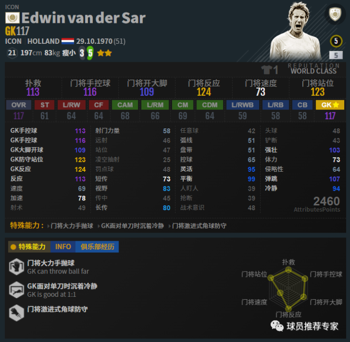“长臂猿”范德萨拥有197的傲人身高,虽然扑救较低,但是站位和反应都非常高,门将站位最接近布冯的男人,配合上他这197的身高,搓射想攻破他把守的打门是非常困难的。隐藏也非常棒,有大力手抛球和门将1V1,激进式的角球防守让其在不仅仅防守角球的时候,包括侧方向的高空球或者传中都能出来一一摘下,这是非常好用的一个门将特性。