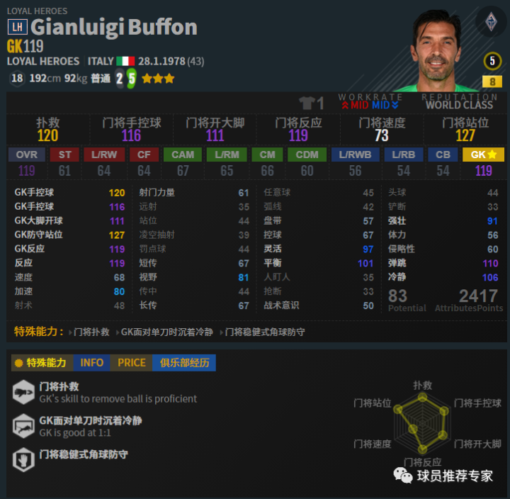 布冯VT和LH赛季,个人更推崇LH赛季,两个赛季用下来确实,不知道是心理作用还是其他作用,总感觉LH赛季192cm身高守门更稳。布冯因为有夸张的门将站位,所以即使192的身高也能让他防下非常多的搓射。因为站位好了,你的选位就更合理,即使一些刁钻的球,也能够更轻松的去处理。这或许就是为什么布冯仅192身高也这么好用的原因。布冯守门,真的不看身高,他的门将选位确实太厉害了。不过缺点也是有的,就是隐藏少一个大力手抛球。