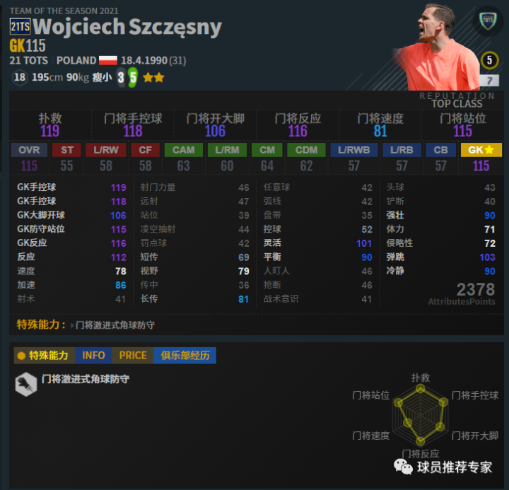 什琴斯尼的扑救能力很强,这种善于扑救的高反应、高身高门将是非常推荐的。而且瘦小体型也是比较舒服的,不过缺点是隐藏很一般,没有大力手抛球这是比较蛋疼的,没有门将1对1也稍稍减分。赛季选择方面21TS工资18稍稍有点高但是也还在可以接受的范围,BOE金卡也是可以选择的,15的工资也是比较舒服的。