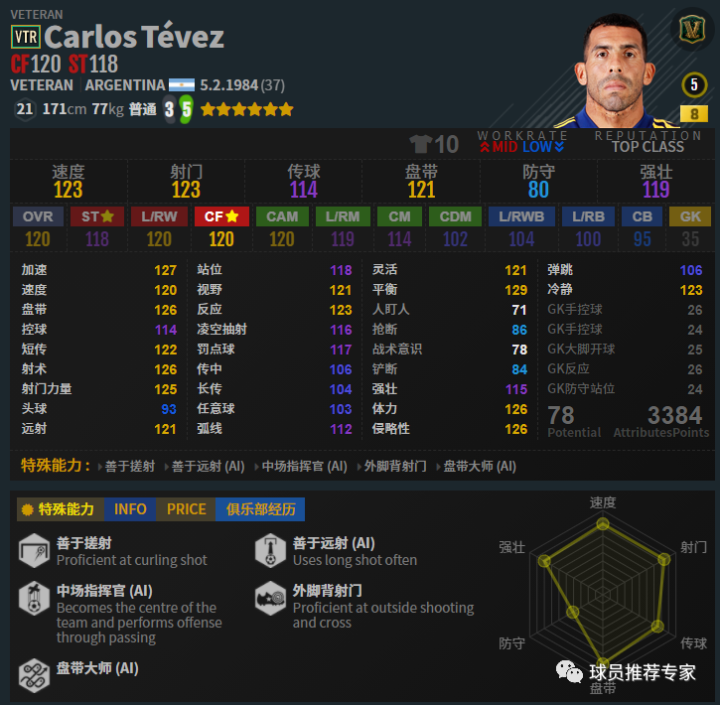 特维斯是一名不错的影锋,虽然说咱大多数球迷对他比较反感,但是抛开这些场外因素,游戏里的特维斯确实是有一定实力的影锋。特维斯身体对抗很强,小墩子的体型让其非常能挤,射术也很精湛,远射能力也不错,唯一一个缺点就是逆足只有3。这是比较蛋疼的,也是比较减分的地方。毕竟影锋这个位置如果能左右开弓那肯定是更加舒服的。赛季选择方面VT和MC赛季都是不错的选择,LH赛季如果高强也可以用。