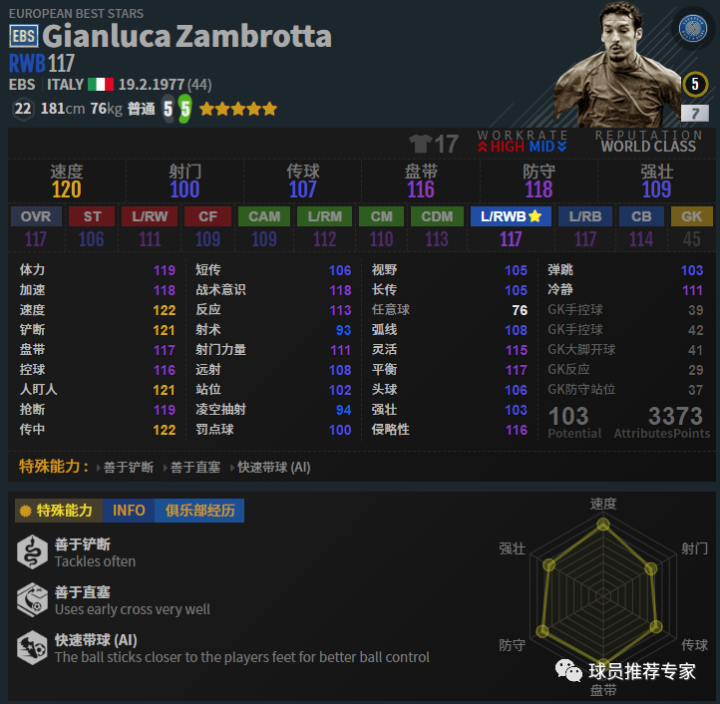 赞布罗塔双5脚无论是左边还是右边都没问题。赞布罗塔属于那种能力很全面但是各方面都不算特别突出的球员,但是各方面的能力又都还可以,无论是速度、盘带、防守、传中他都有,身体、模型各方面也都可以,有点万金油的味道。赛季选择方面ICON、EBS和LH都是不错的选择,ICON工资稍高,工资不宽裕的可以选择EBS或者LH。EBS相比LH速度会快一些,而LH赛季尽量高强最好能金卡来弥补速度。