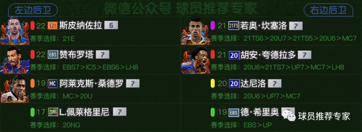 “宝强”夸德拉多是不错的边后卫,甚至做的有点夸张了。感觉这个宝强做的有点太强了,各方面都非常顶,别看72kg的体重,但是对抗没想象中的差,如果能配上顶牛助教,完全就是完美边后卫了。进攻防守都非常出色,速度还超快,传中也非常准,真心推荐。赛季选择方面因为20U和21TS是比较难搞到金卡的,所以7卡可以先用,也很顶了。UP赛季能力值低一点是有机会搞到金卡的。平民的话就选择银卡就行,MC和LH赛季是不建议拿来打边后卫的,这俩更适合打边锋或者边前卫。