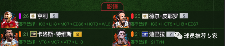 影锋方面亨利大帝是绝对的首发级别的第一选择,全游戏都是数一数二的顶级影锋。皮耶罗可作为第二选择,卡洛斯·特维斯和迪巴拉可作为替补选择。