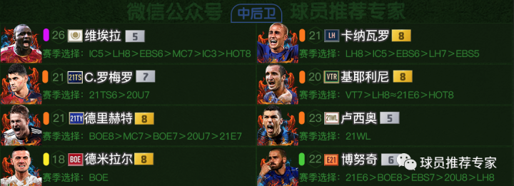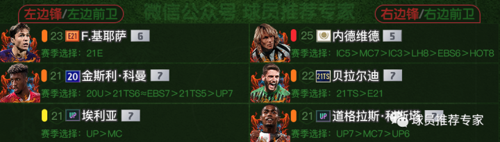 边锋方面内德维德一枝独秀,其余的几位橙级比起内德维德确实差点意思,不过也都是具备首发资格的边锋。特别是基耶萨,E21基耶萨出了以后可以说是绝对的极品边锋,突破能力极强,非常推荐!