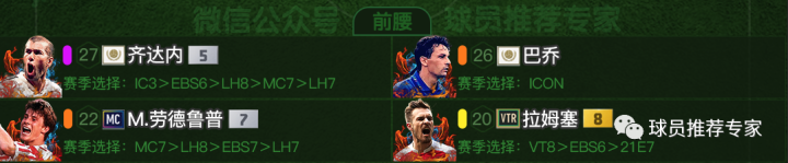 前腰方面齐达内妥妥的第一选,巴乔这种高工资低能的个人是不太推荐的,占了26的工资却仅仅只是个橙级弟弟,相比人家姆巴布15工资红级,真心弟弟,完全没必要去入。劳德鲁普和拉姆塞可作为替补选择。