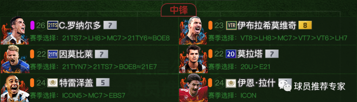 中锋方面C罗鹤立鸡群,伊布、因莫比莱、莫拉塔群新割据,因莫比莱蛮不错的,状态好也可以作为首发的。莫拉塔实战没数据那么华丽,数据非常漂亮,但实际用起来感觉比数据显示的稍逊一筹。而ICON赛季的特雷泽盖和伊恩·拉什只能算比较一般,这俩身体都偏软。维埃里目前没更好的赛季卡就不推荐了,身体可以就是速度太慢,喜欢的可以用。因扎吉的主要是3逆足减分,跑位还是很风骚的,喜欢的也可以用,但我这边名额有限就不做推荐了。