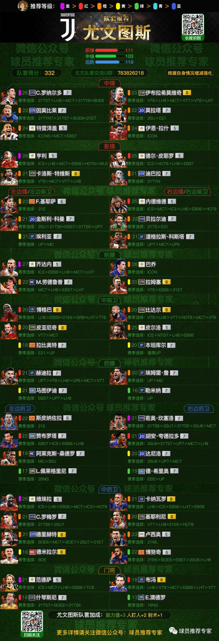 我们可以设定一套规则来反应队套强度。设定紫色12分,红色10分,橙色8.5分(最终结果四舍五入),黄色7分,绿色6分,青色3分,蓝色1分,统计36人大名单的球员的得分(前锋方面:中锋+影锋6名,边锋6名;中场方面:前腰、中场、后腰各4名;后防方面:中卫6名,边后卫4名,门将2名)。根据规则得出尤文套的36人总得分是:332。