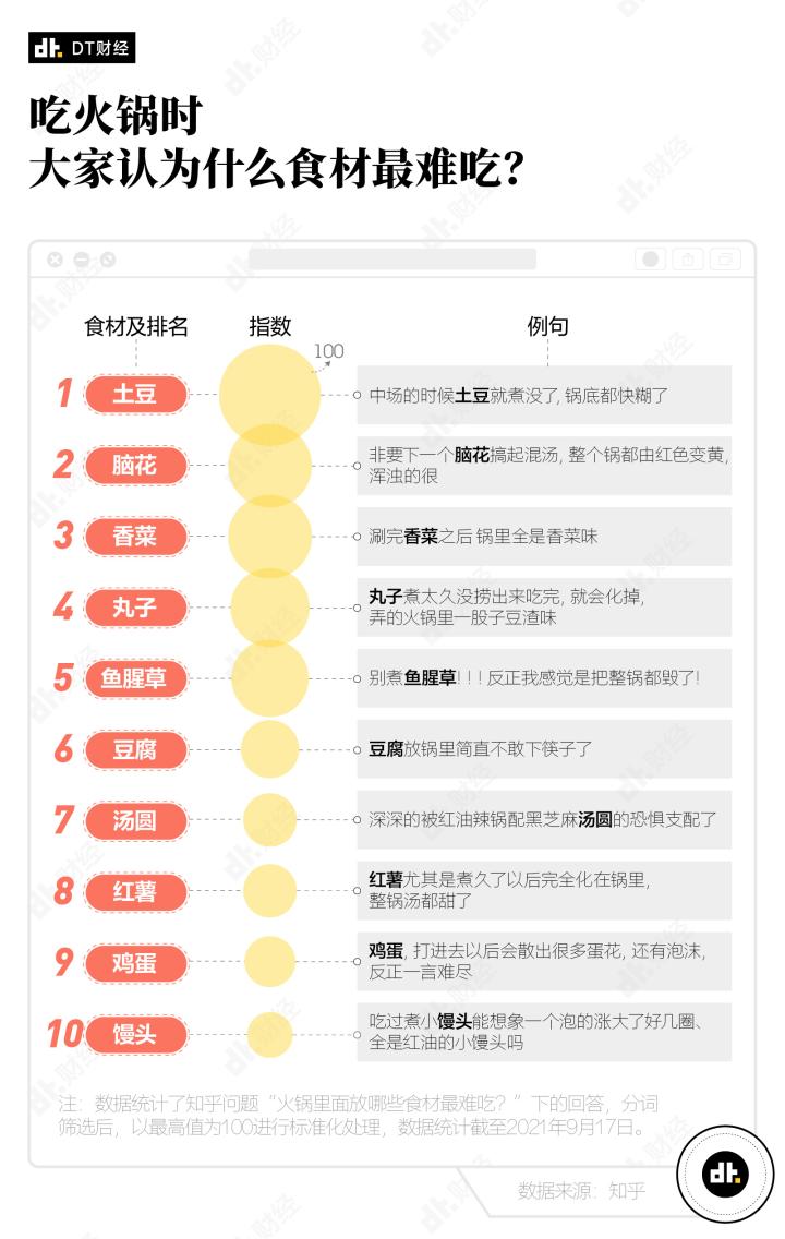就拿网友众选第一的土豆来说,爱吃的人认为“土豆片是最适合重油重麻辣的菜品了,喜欢吃爽脆一点就早点起锅,喜欢耙软一点就多煮一会儿”,不喜欢的人吐槽它“煮着煮着直接变成一锅糊糊”。