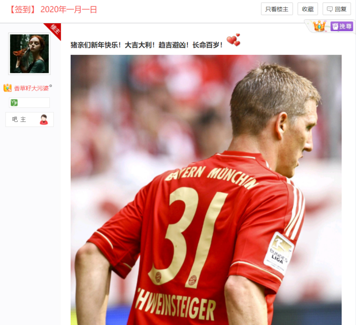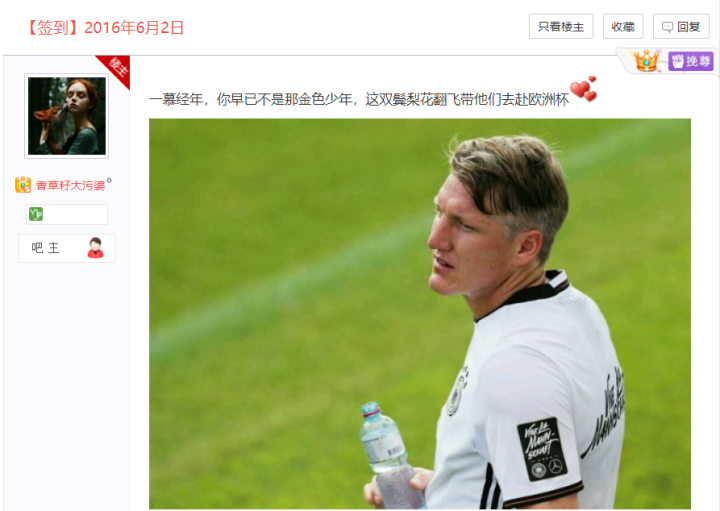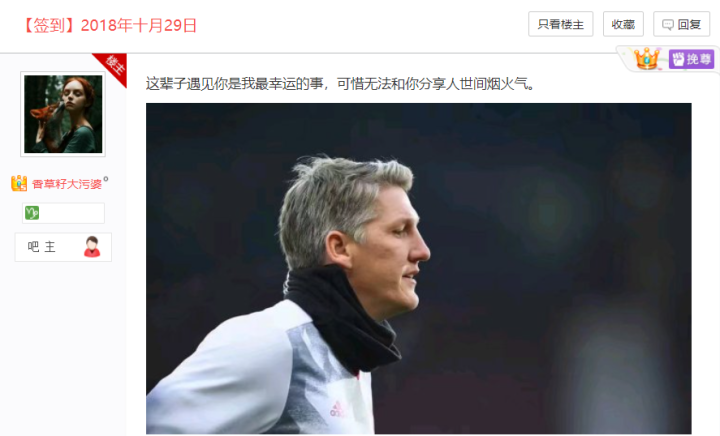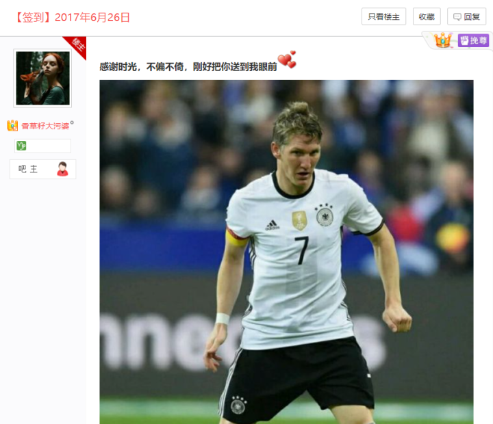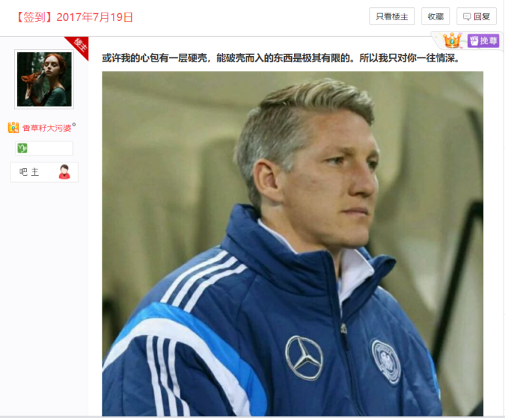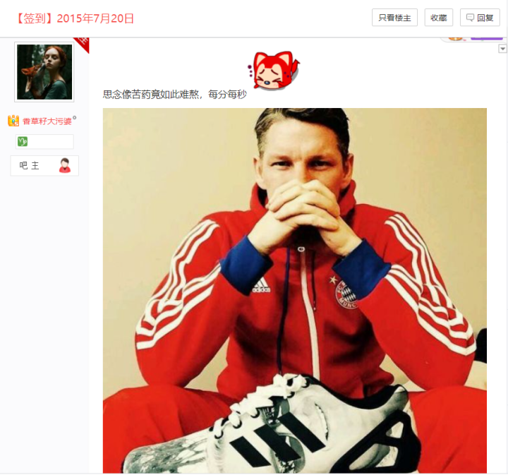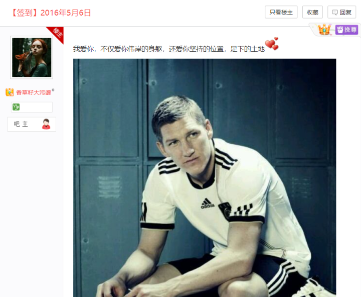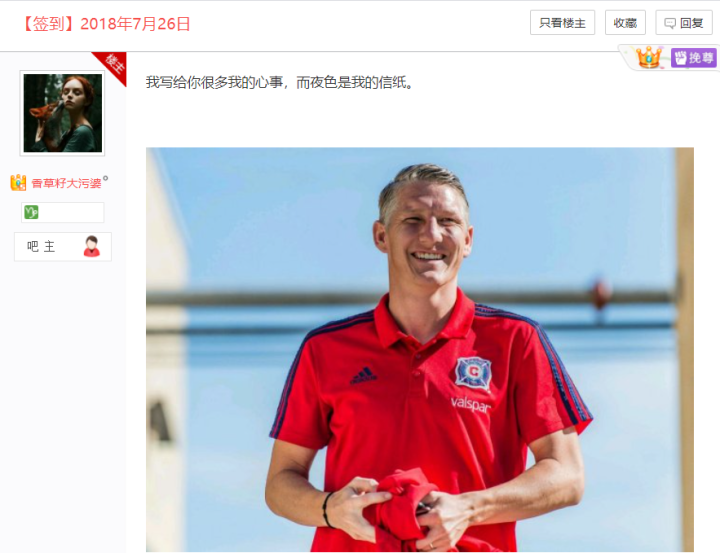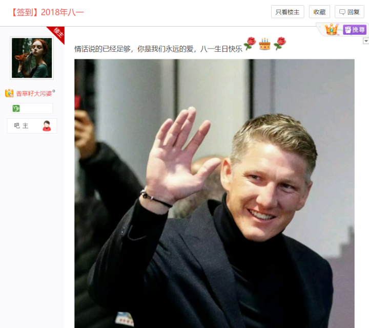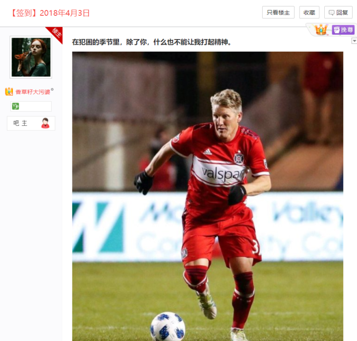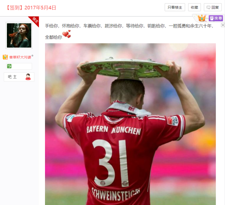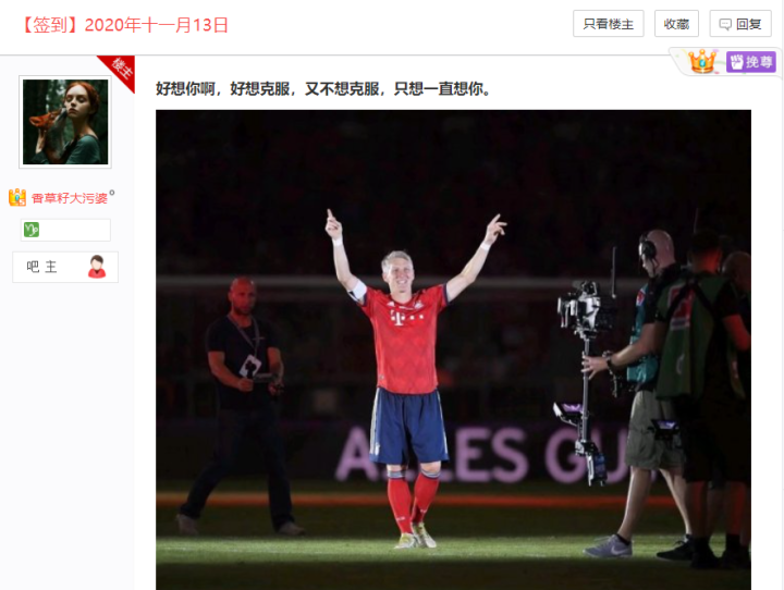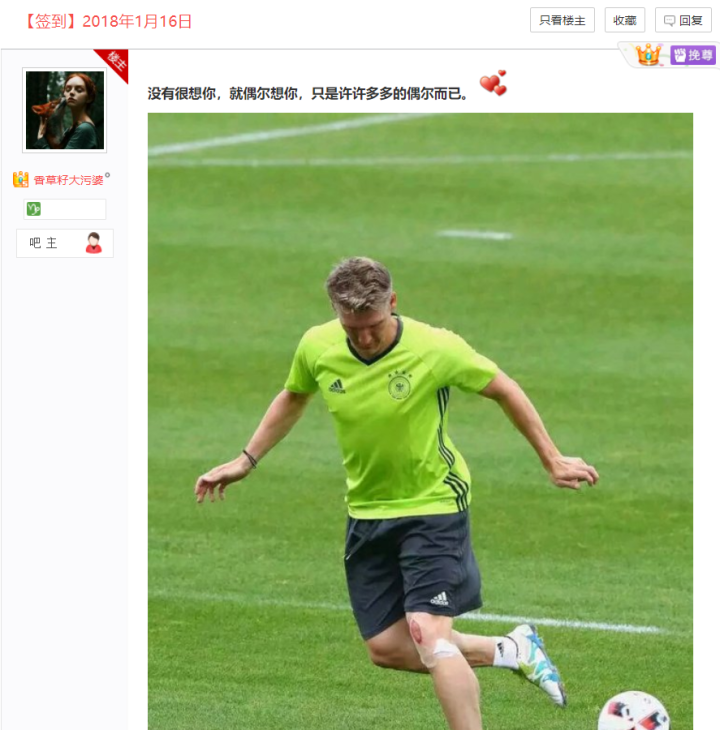 看资料,香草在X吧入驻时间长达11.1年,期间内容九成以上都是围绕“小猪”,但真正形成体系是在2015年7月左右,转折事件是拜仁慕尼黑俱乐部来北京打商业比赛,或许是因为终于等到了与心爱球队近距离接触的机会,她站立在人潮中,看千百双手挥舞,却没能看到心爱球星的影踪(两个月前,施魏因斯泰格离开了效力十七年的拜仁慕尼黑,转会去了曼联),百感交集之下开始了漫长而又单调、深情又不落俗套的表白,从那时起,一图一文一签到,一心一人一小猪,日复一日,年复一年,风雨无阻,延续至今。