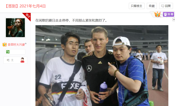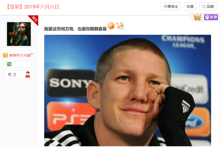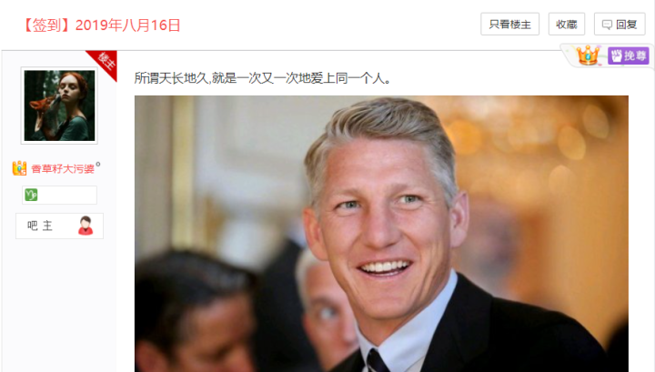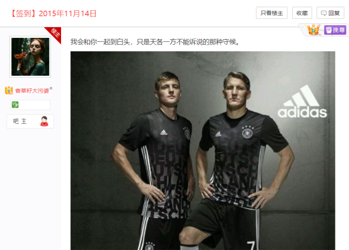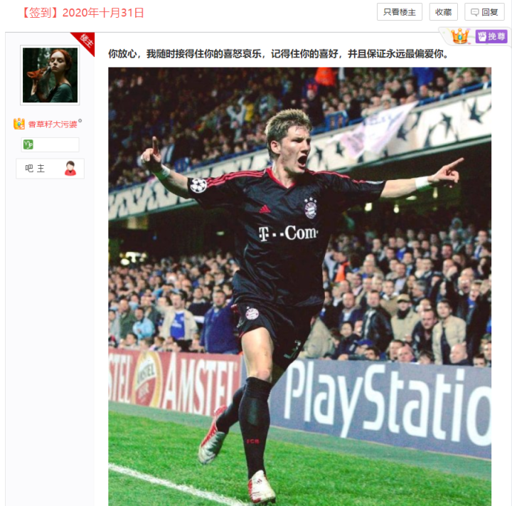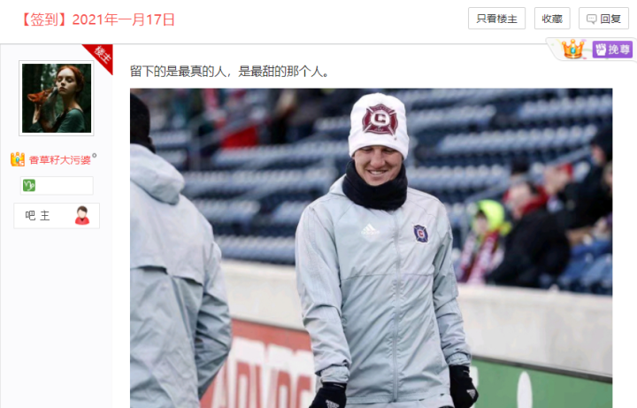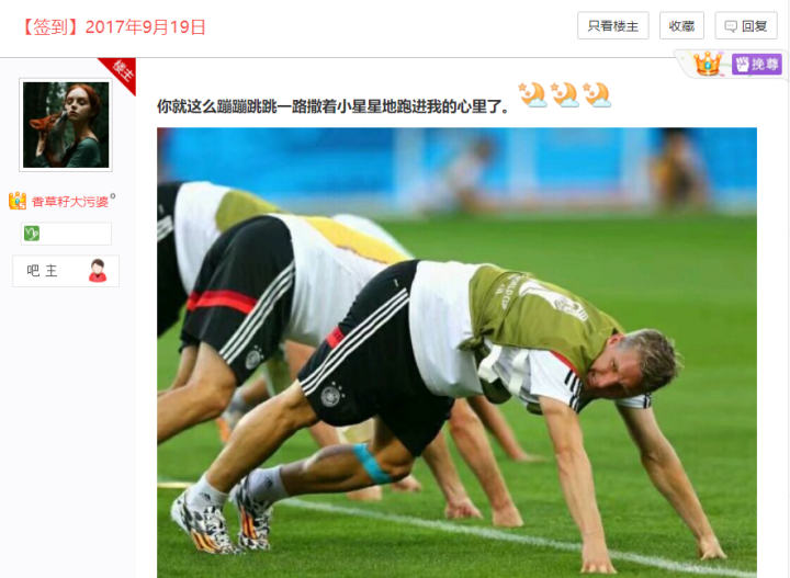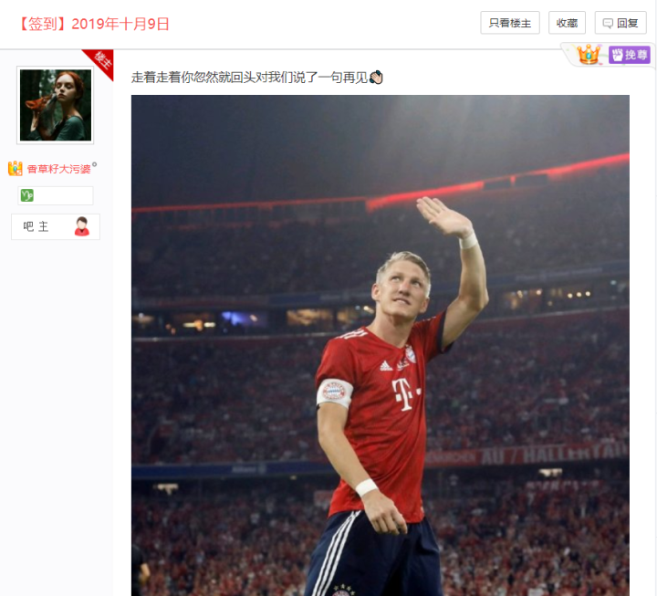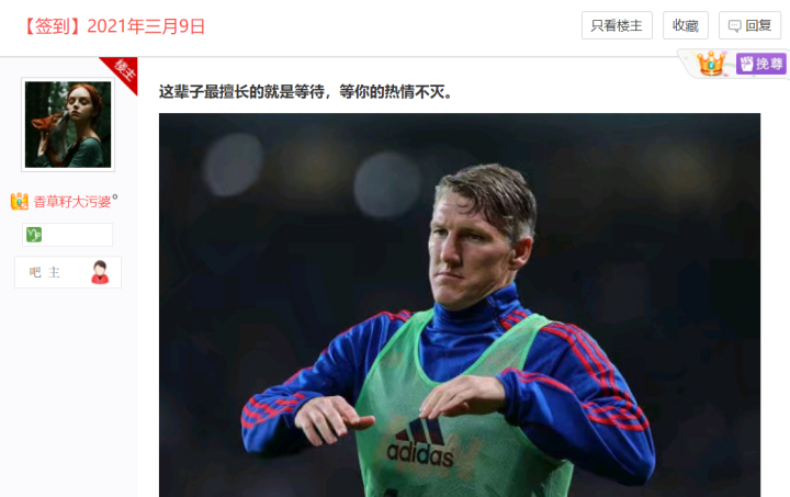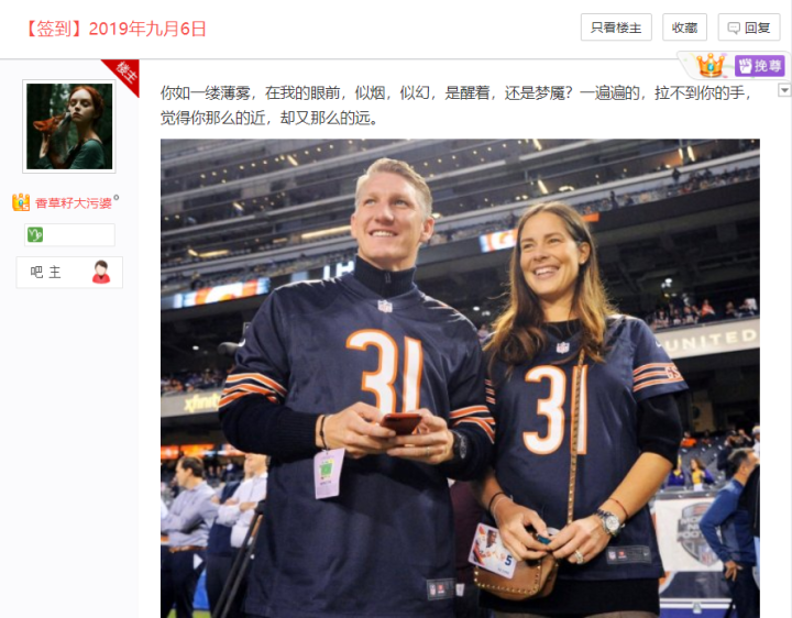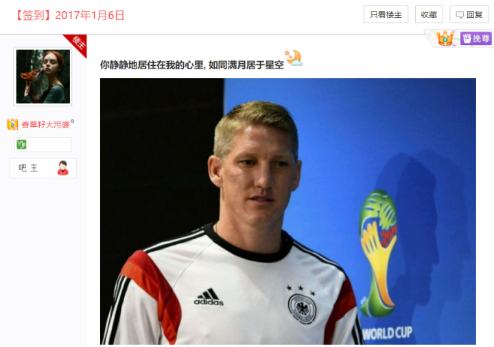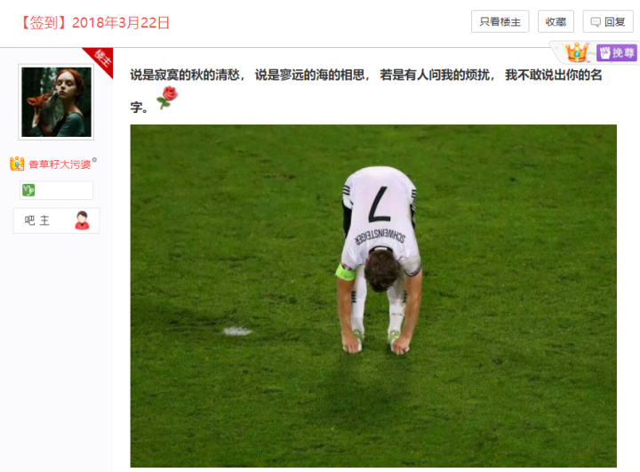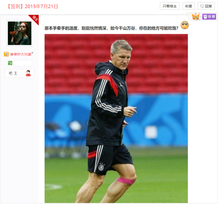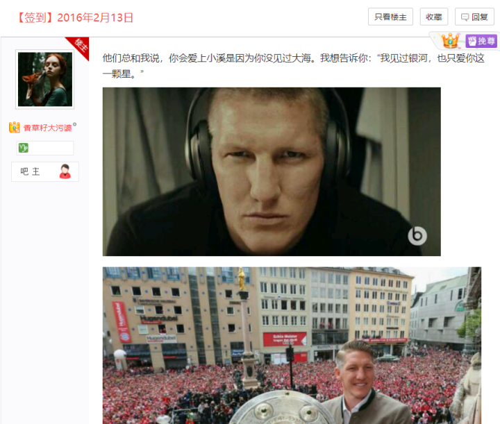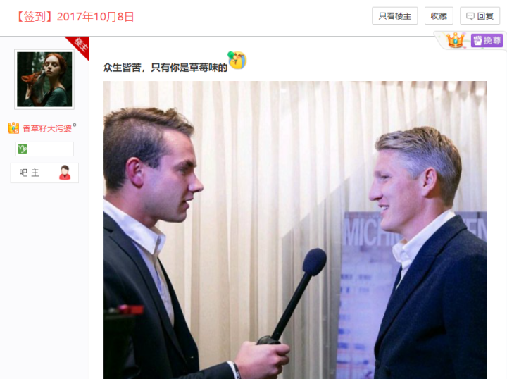 看资料,香草在X吧入驻时间长达11.1年,期间内容九成以上都是围绕“小猪”,但真正形成体系是在2015年7月左右,转折事件是拜仁慕尼黑俱乐部来北京打商业比赛,或许是因为终于等到了与心爱球队近距离接触的机会,她站立在人潮中,看千百双手挥舞,却没能看到心爱球星的影踪(两个月前,施魏因斯泰格离开了效力十七年的拜仁慕尼黑,转会去了曼联),百感交集之下开始了漫长而又单调、深情又不落俗套的表白,从那时起,一图一文一签到,一心一人一小猪,日复一日,年复一年,风雨无阻,延续至今。