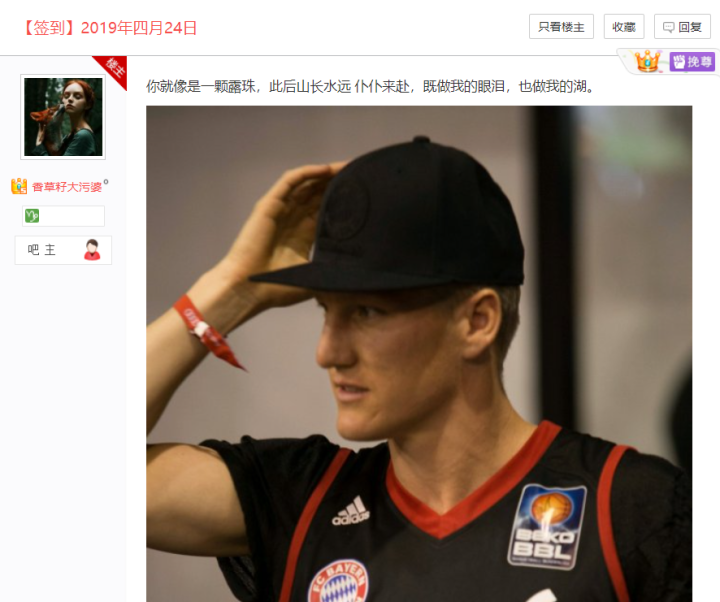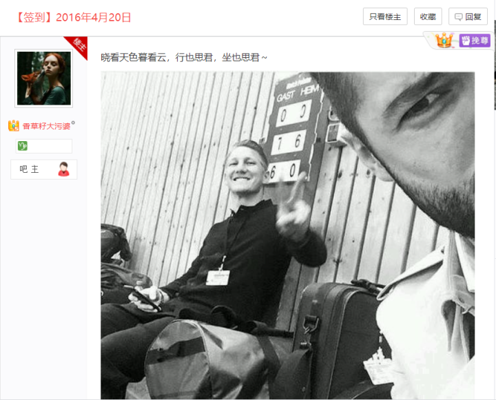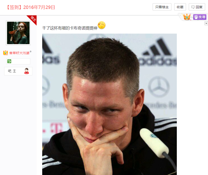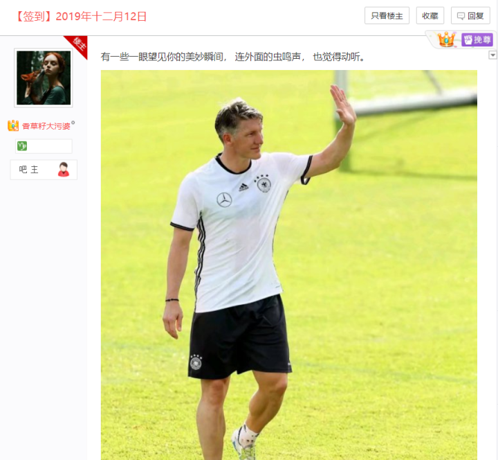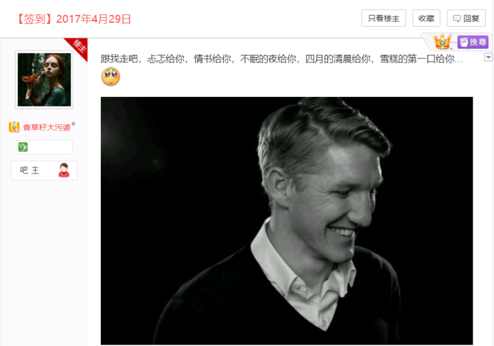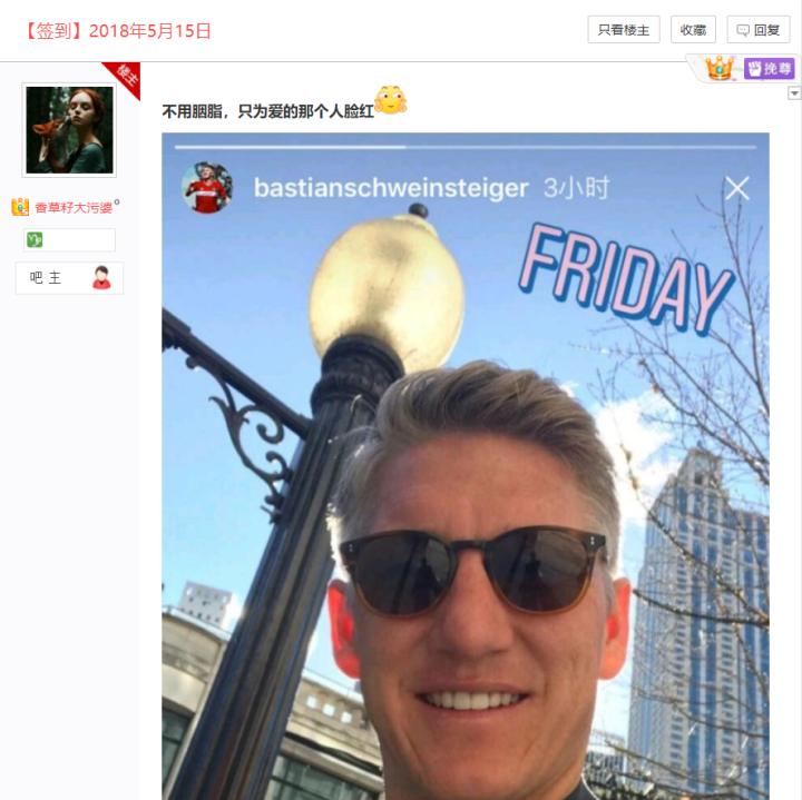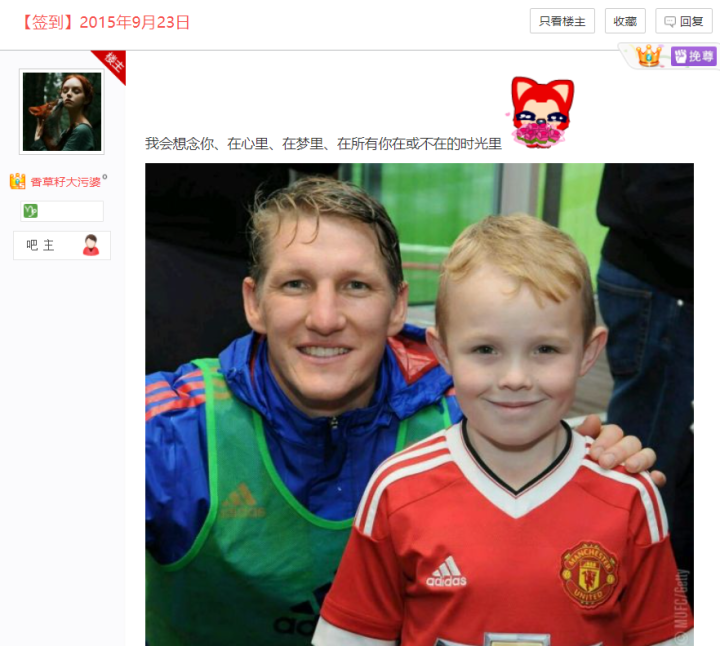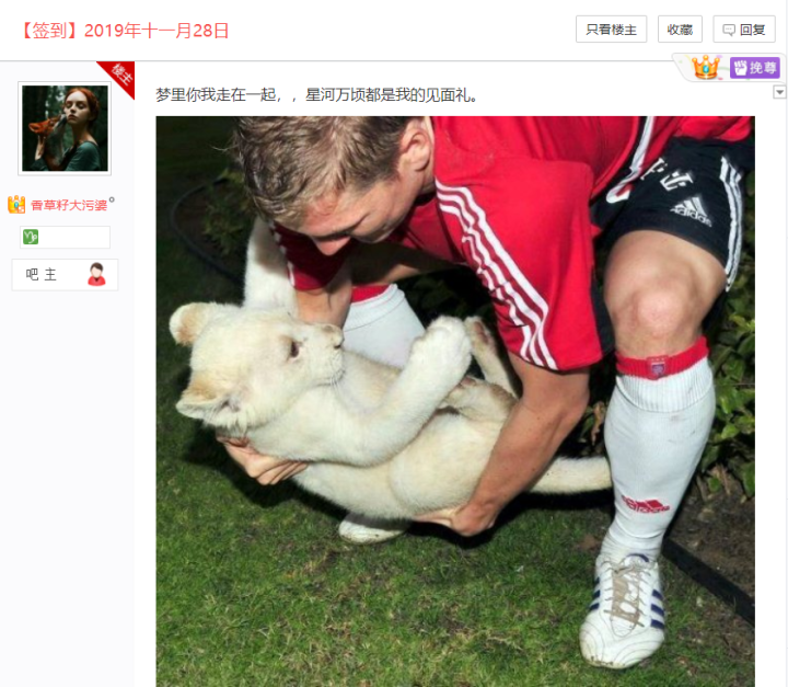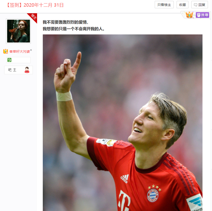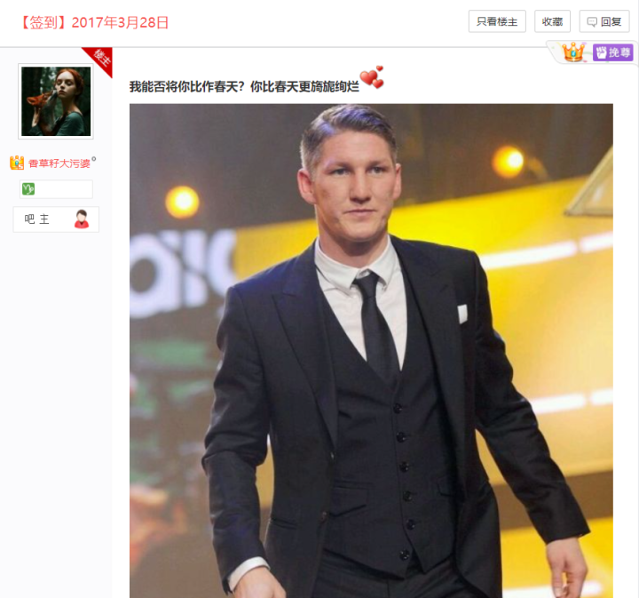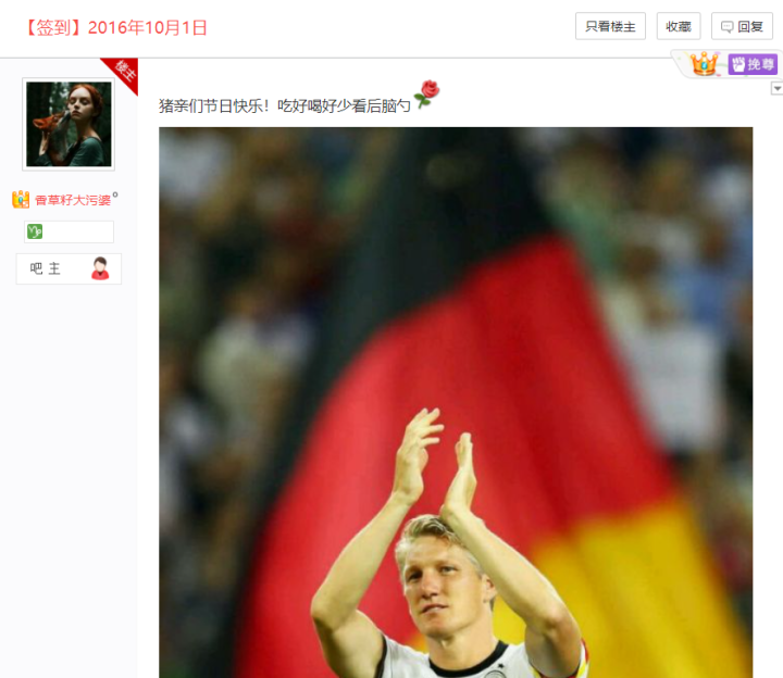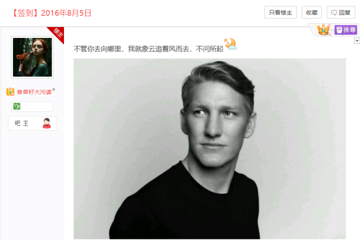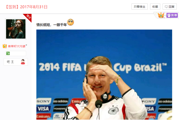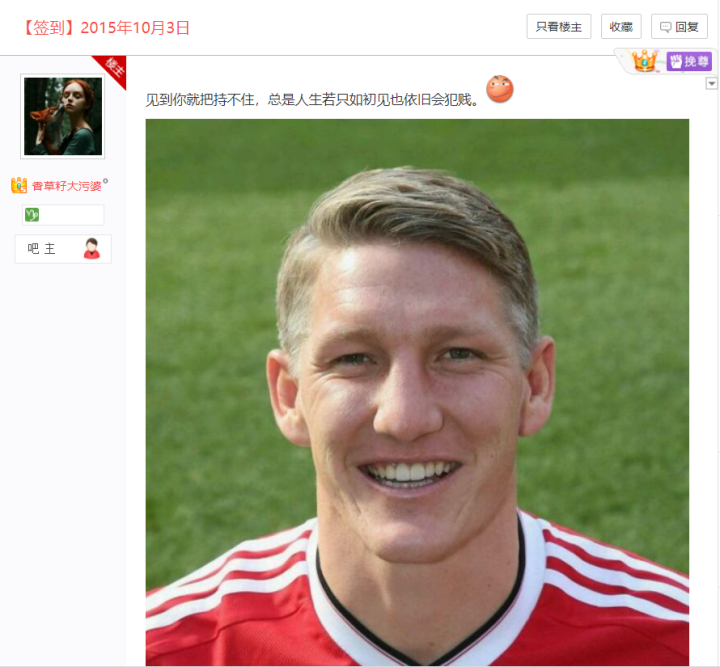 看资料,香草在X吧入驻时间长达11.1年,期间内容九成以上都是围绕“小猪”,但真正形成体系是在2015年7月左右,转折事件是拜仁慕尼黑俱乐部来北京打商业比赛,或许是因为终于等到了与心爱球队近距离接触的机会,她站立在人潮中,看千百双手挥舞,却没能看到心爱球星的影踪(两个月前,施魏因斯泰格离开了效力十七年的拜仁慕尼黑,转会去了曼联),百感交集之下开始了漫长而又单调、深情又不落俗套的表白,从那时起,一图一文一签到,一心一人一小猪,日复一日,年复一年,风雨无阻,延续至今。