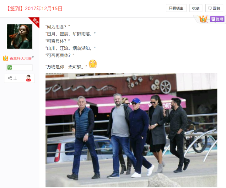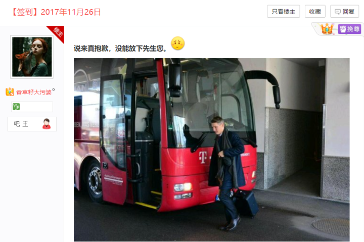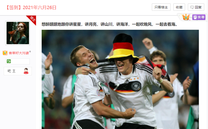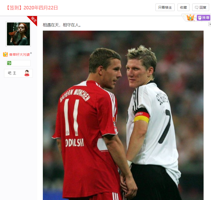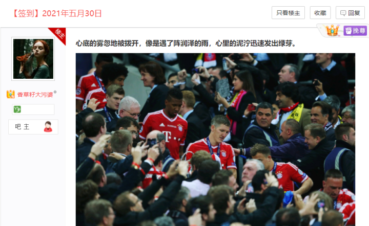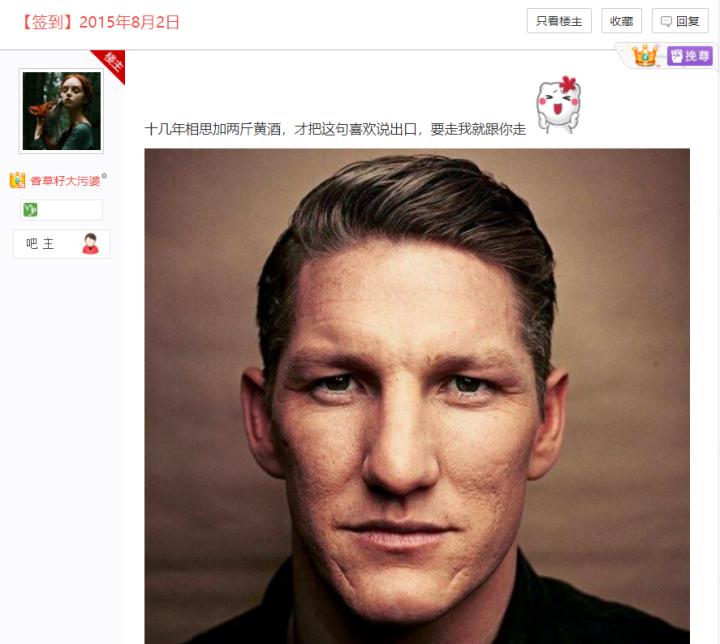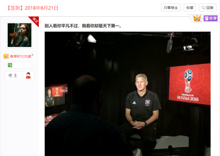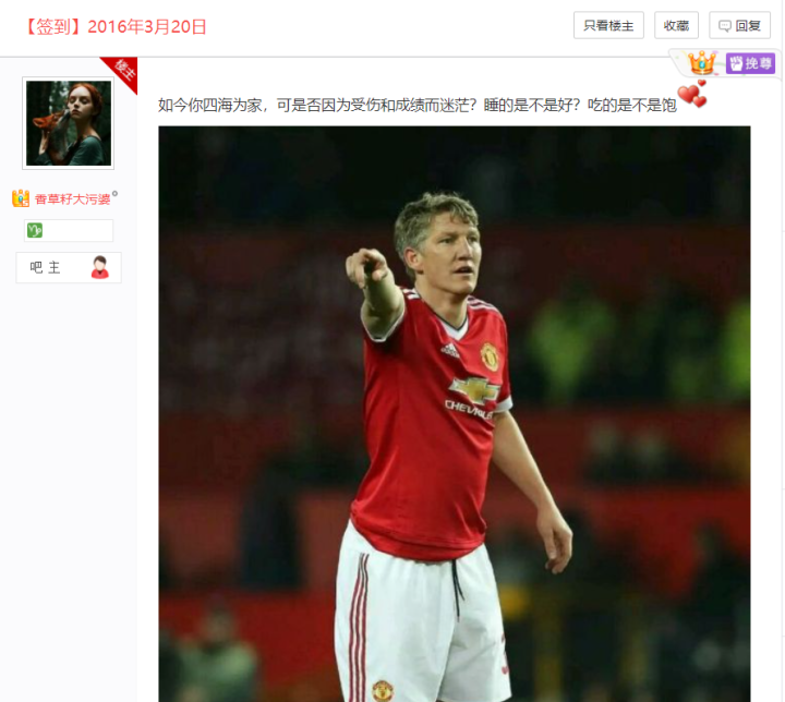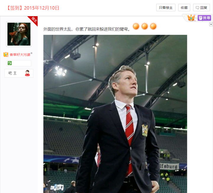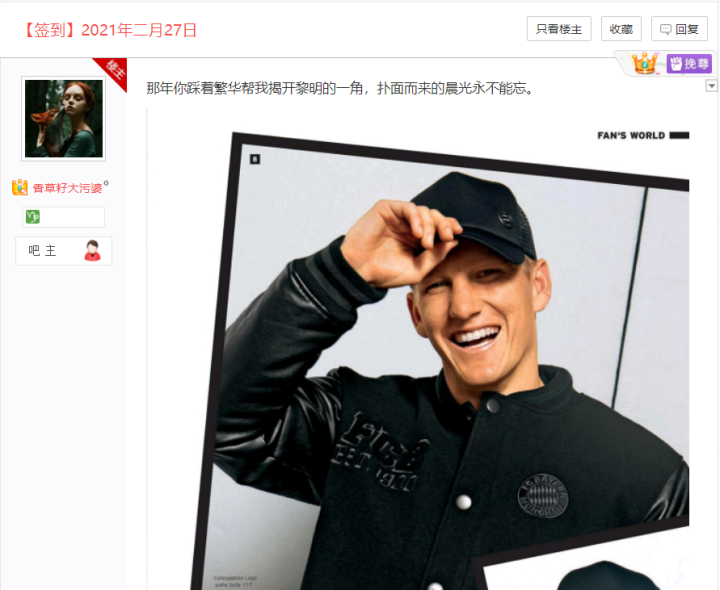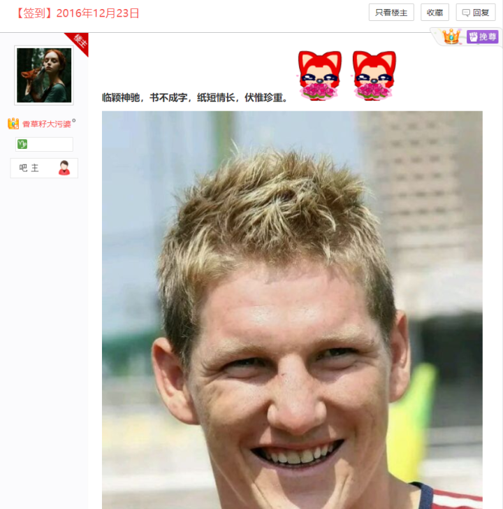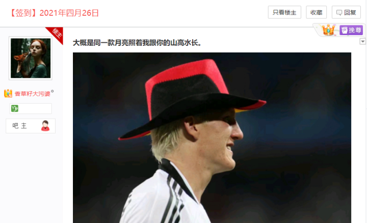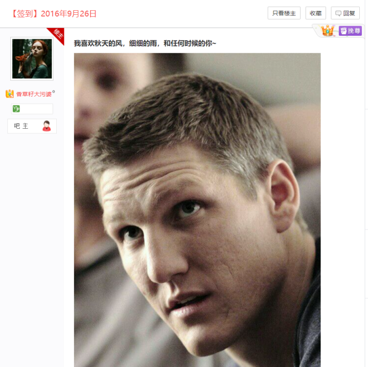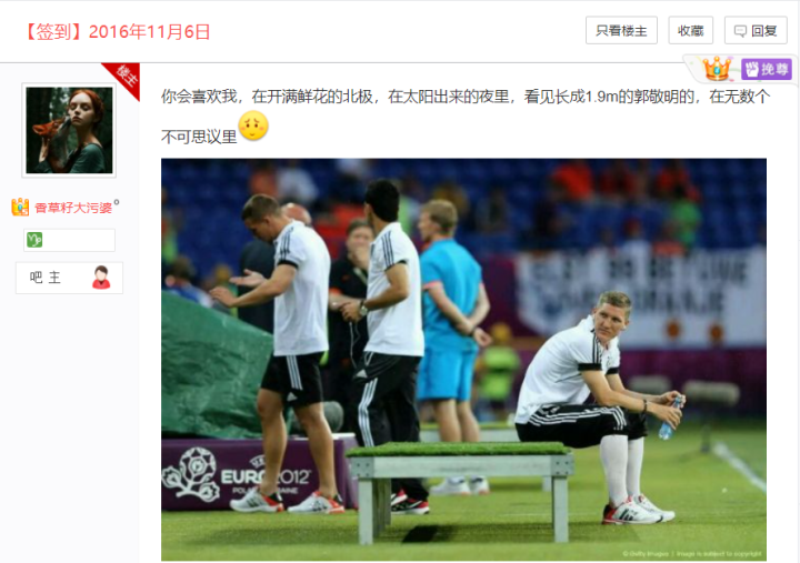 看资料,香草在X吧入驻时间长达11.1年,期间内容九成以上都是围绕“小猪”,但真正形成体系是在2015年7月左右,转折事件是拜仁慕尼黑俱乐部来北京打商业比赛,或许是因为终于等到了与心爱球队近距离接触的机会,她站立在人潮中,看千百双手挥舞,却没能看到心爱球星的影踪(两个月前,施魏因斯泰格离开了效力十七年的拜仁慕尼黑,转会去了曼联),百感交集之下开始了漫长而又单调、深情又不落俗套的表白,从那时起,一图一文一签到,一心一人一小猪,日复一日,年复一年,风雨无阻,延续至今。