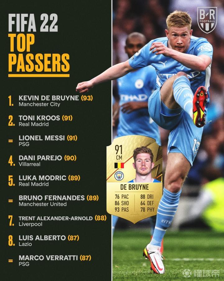 FIFA22传球能力值榜单:德布劳内第一,克罗斯、梅西并列第二