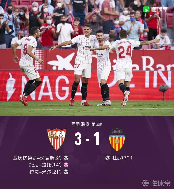 北京时间9月23日凌晨1:30,西甲第6轮,塞维利亚主场迎战瓦伦西亚,上半场比赛戈麦斯首开纪录,随后托尼-拉托自摆乌龙,拉法-米尔挑射得分,杜罗为瓦伦西亚搬回一城。易边再战,双方再未能攻破对方大门,最终塞维利亚3-1战胜瓦伦西亚。