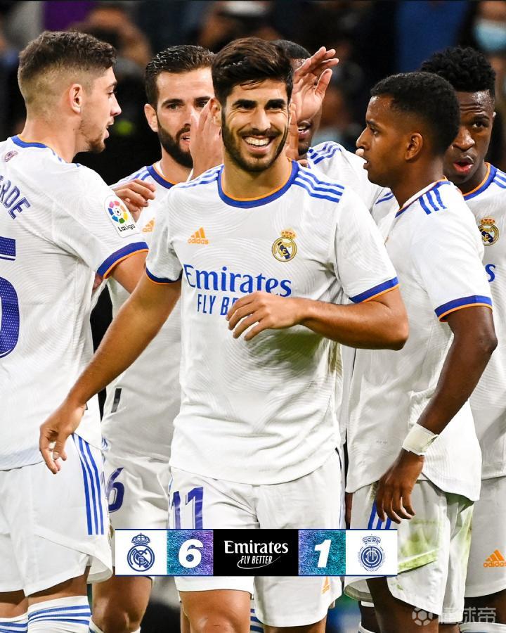 凭借本场比赛6-1大胜马略卡,皇马本赛季西甲前6轮已打入21球,其中本泽马直接参与了15球。