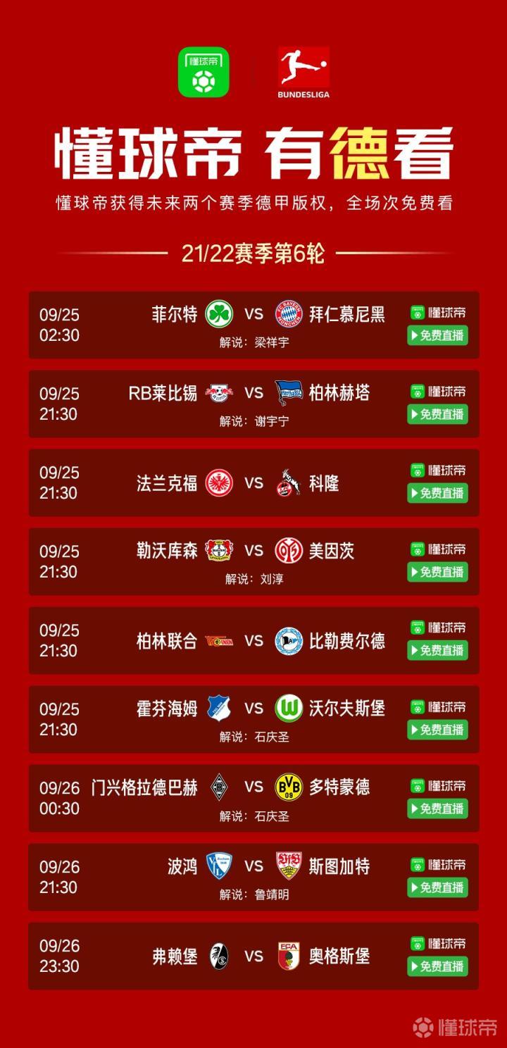 北京时间今晚及明天凌晨,五大联赛又将进行多场精彩的比赛。懂球帝将继续为大家带来德甲联赛全场次视频直播,其中@谢宇宁 和@足球解说员刘淳 将在今晚21:30分别带来莱比锡vs柏林赫塔、勒沃库森vs美因茨的解说评述,而@足球解说-石庆圣 将在今晚21:30以及明天00:30分别对霍芬海姆vs沃尔夫斯堡以及门兴格拉德巴赫vs多特蒙德进行解说评述。