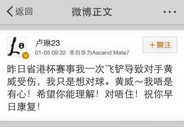 当时广东队带着一球的优势来到了香港大球场。比赛进行到第29分钟,港队中场黄威控球失误,急于抢回皮球的卢琳对前者来了一记飞铲。鞋钉正中黄威的脚踝处。