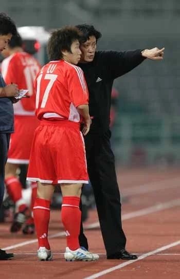 (图)2005年东亚运动会,国家队在先进一球的情况遭到朝鲜队逆转。比赛途中朱广沪指导向卢琳面授机宜 ©Shangdaxuele.cn