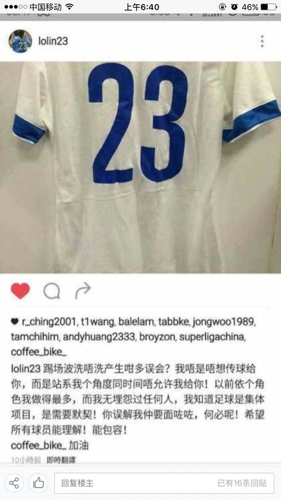 “ 踢场波洗唔洗产生咁多误会?我唔是唔想传球给你,而是站系我个角度同时间唔允许我给你!以前依个角色我做得最多,而我无埋怨过任何人,我知道足球是集体项目,是需要默契!你误解我仲要面咗咗,何必呢!希望所有球员能理解!能包容!”