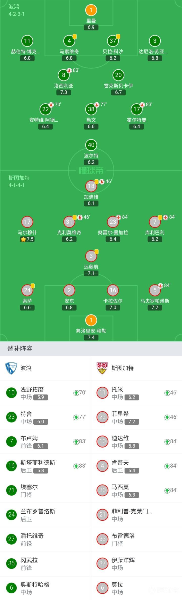 波鸿首发:1-里曼、3-达尼洛-苏亚雷斯、4-马索维奇、8-洛西利亚(83'16-斯塔菲利德斯)、11-赫伯特-博客霍恩、17-霍尔特曼(83'7-布卢姆)、20-雷克斯贝卡伊、22-安特维-阿德杰伊(70'10-浅野拓磨)、37-贝拉-科沙、38-勒文(77'23-特舍)、40-波尔特