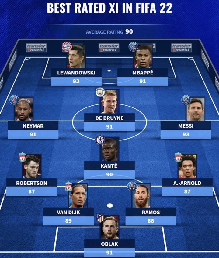 德国转会市场网站列出了FIFA22能力值最强11人阵容,梅西、莱万多夫斯基、内马尔以及姆巴佩入选。