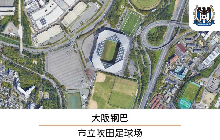 大阪钢巴位于大阪府吹田市,这是一座曾经主办过世博会的城市。大阪钢巴的主场——市立吹田足球场就在世博会纪念公园南部,这座球场启用于2015年,设施比较先进,外立面造型也很前卫,目前由松下电器产业株式会社冠名,松下的总部就设在大阪府门真市,距离吹田市很近。