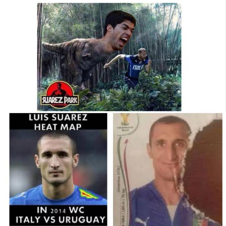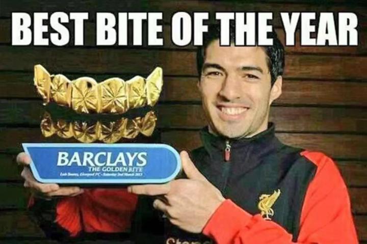 而内马尔的前任队友苏亚雷斯,也是meme的常用素材。早在阿贾克斯效力的时候,苏亚雷斯就开启了自己的“咬人生涯”。在众目睽睽之下,苏亚雷斯曾咬过埃因霍温球员巴克尔,当时双方球员发生纠纷,苏亚雷斯毫不犹豫地对准对方肩膀一口咬下,最终收到一张禁赛7场的罚单。